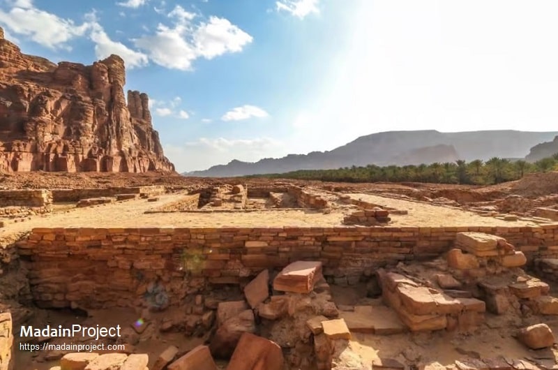 The temple itself forms part of a larger sacred precinct that once served as a focal point for the religious life of the Kingdom of Lihyan, whose capital was situated at al-Khuraybah. Excavations and surface surveys indicate that the temple complex functioned as a locus of cultic activity dedicated to one of the principal Lihyanite deities, possibly Dhu-Ghābah, whose name appears in inscriptions from the same area. Its construction reflects the consolidation of Lihyanite statehood and the institutionalization of formal religious architecture in north-west Arabia. The sanctuary thus provides a key reference for understanding the intersection of religion, political authority, and monumentality in the pre-Nabataean Arabian oases.