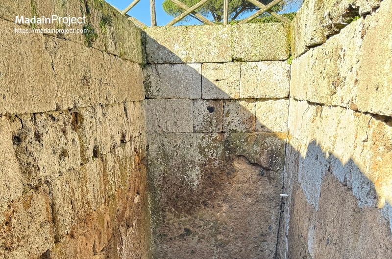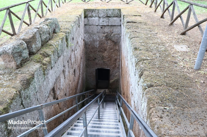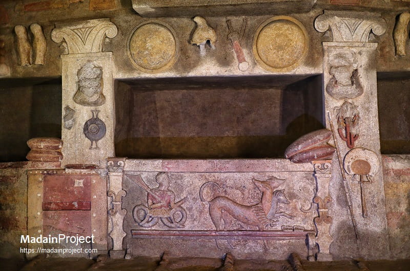 Tomb of the Reliefs (tomba dei rilievi), which belonged to the Matuna family according to the engravings placed on a cippus inside the room, preserves the painted stucco representations of all the furnishings, that is, the objects that accompanied the deceased. The objects are hung on the walls; it is the only Etruscan tomb decorated with stucco reliefs, decidedly unusual compared to the usual frescoes. The tomb is 7.7 metres long, 6.5 metres wide and 2.6 metres high.