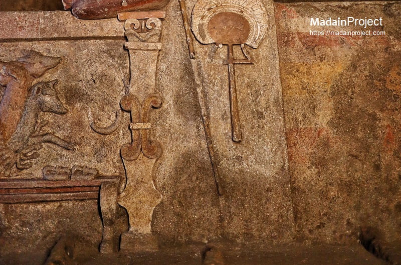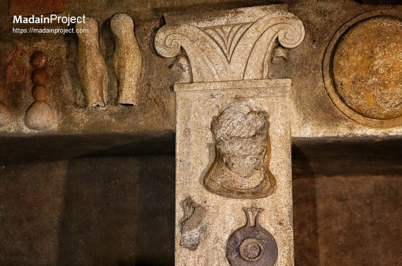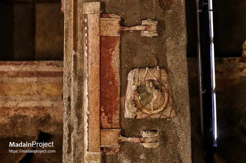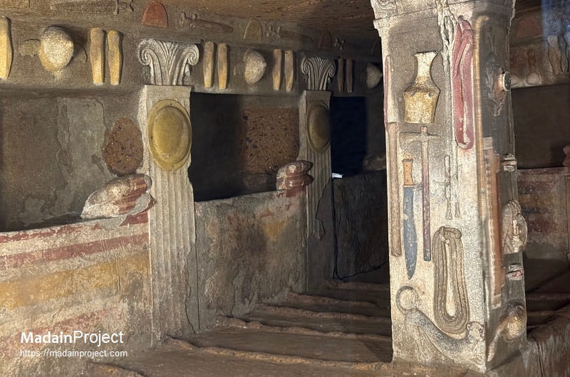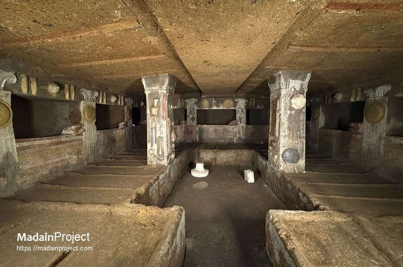 The hypogeum-crypt is unique for its extensive program of polychrome stucco reliefs that simulate the interior of an aristocratic domestic residence. The tomb consists of a singular, quadrangular chamber (approx. 7.7 x 6.5 meters) accessed via a steeply descending dromos. Its gabled ceiling is supported by two square piers featuring Aeolian (or Proto-Ionic) capitals.