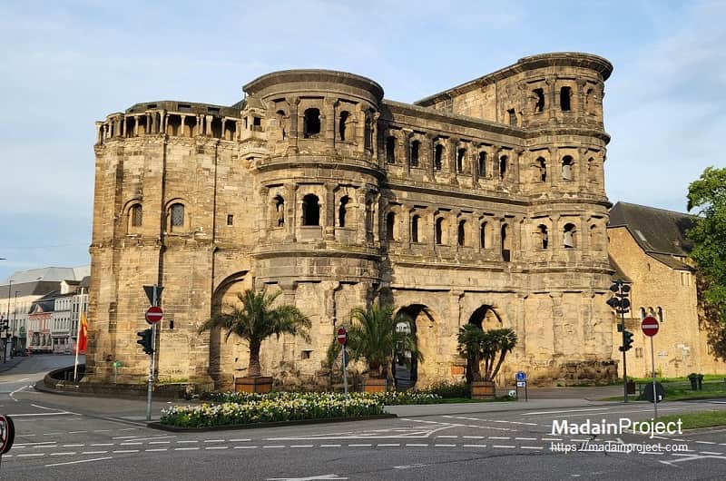 The Porta Nigra is the most prominent surviving Roman city gate north of the Alps, located in Trier, Germany. Constructed in the late second century CE from massive grey sandstone blocks, its weathered dark appearance inspired its modern name. The gate exemplifies Roman engineering excellence, combining defensive functionality with monumental urban symbolism. Serving both as a controlled entry point and a statement of imperial authority, Porta Nigra reflects Trier’s strategic significance as a provincial capital of Gallia Belgica and its proximity to the Rhine frontier. Over the centuries, it has been adapted for religious use, preserved through medieval modifications, and restored in the modern era