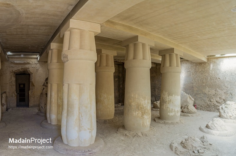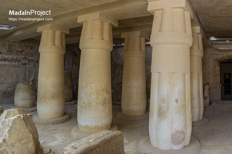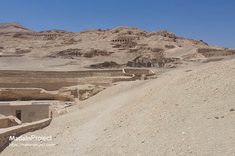 TT55’s internal arrangement follows the broad pattern used for elite Theban tomb chapels in the late Eighteenth Dynasty: an entrance corridor (often cut through the village face), leading into a pillared or columned main hall that functioned as the public chapel, with smaller side rooms or a rear chamber that served funerary and storage purposes. In Ramose’s case, published plans and descriptions indicate a long entryway followed by a principal hall that originally contained a substantial number of papyrus-shaft columns, together creating an impression of a formal, almost monumental chapel integrated into the living space of the Theban village necropolis. Excavation and conservation records emphasize that much of the surviving architecture is heavily restored or supported in modern interventions, but the fundamental plan—entrance, columned hall, and subsidiary rooms—remains clear from Davies’s plates and subsequent field reports. Architectural features such as block-cut column bases and preserved plastered surfaces corroborate the tomb’s intended function as a public cult and funerary installation rather than a purely subterranean burial chamber.