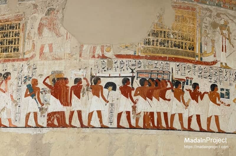 The tomb’s wall decoration is the principal reason for its scholarly prominence. In the earlier registers Ramose’s tomb contains traditional Theban scenes: a detailed funeral procession, mourners, and offering bearers rendered in the conventional proportions and registers of late Amenhotep III–period art. Notably, several sections of TT55 display a marked stylistic shift: figures carved and painted with elongated limbs, attenuated faces, and novel compositions that parallel iconographic changes normally associated with the early years of Akhenaten’s program at Akhetaten. Because these stylistic changes appear within a single monument, Egyptologists frequently cite TT55 when tracing the chronology and diffusion of Amarna-style innovations into private elite contexts. In addition to human figures and narrative funerary scenes, the tomb includes representations of temple architecture and cultic processions that have prompted recent iconographic studies attempting to identify the specific temple complexes depicted and to gauge Ramose’s relationship to royal cultic activity. Conservation photographs and plate reproductions—many first recorded in the Davies volume and reproduced in later museum and photographic archives—show well preserved painted plaster in cream, red, brown, and blue pigments and finely incised raised relief in places where original carving survived.