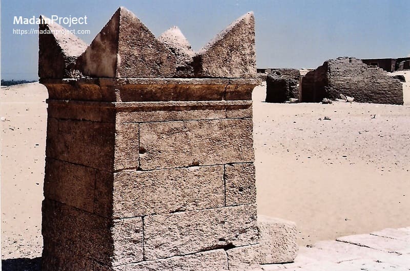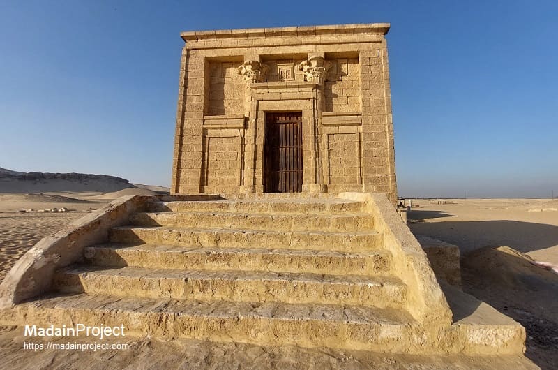 The overall plan of the monument represents a significant innovation in Egyptian tomb design. Rather than following the older models of private New Kingdom or Late Period tombs, the Tomb of Petosiris adopts the ground plan of an Egyptian temple, consisting of a pronaos or hall leading to a sanctuary or shrine. This arrangement reflects a conscious merging of funerary and cultic architecture, symbolically aligning the deceased priest with divine space. The design was further influenced by Greek elements, a feature characteristic of the cultural interplay under the Ptolemies. A striking example is the presence of a monumental horned altar (inspect) in front of the entrance, echoing Hellenistic ritual installations rather than traditional Egyptian mortuary features.