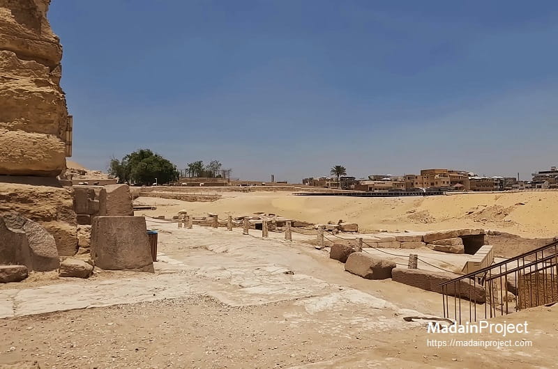 The Valley Temple forms part of the broader funerary complex of Khafre, which includes the pyramid itself, the mortuary temple or the pyramid temple adjoining the pyramid’s eastern side, and a covered causeway connecting these structures. Located at the eastern end of this causeway near the edge of the Nile valley, the temple occupies a strategic position close to the Great Sphinx of Giza, a monumental sculpture that many scholars associate with Khafre’s reign and ideological program of divine kingship.