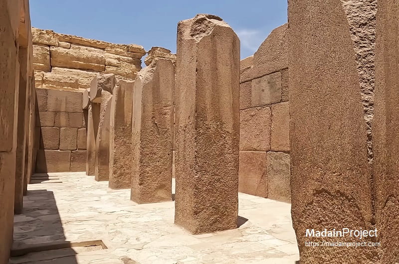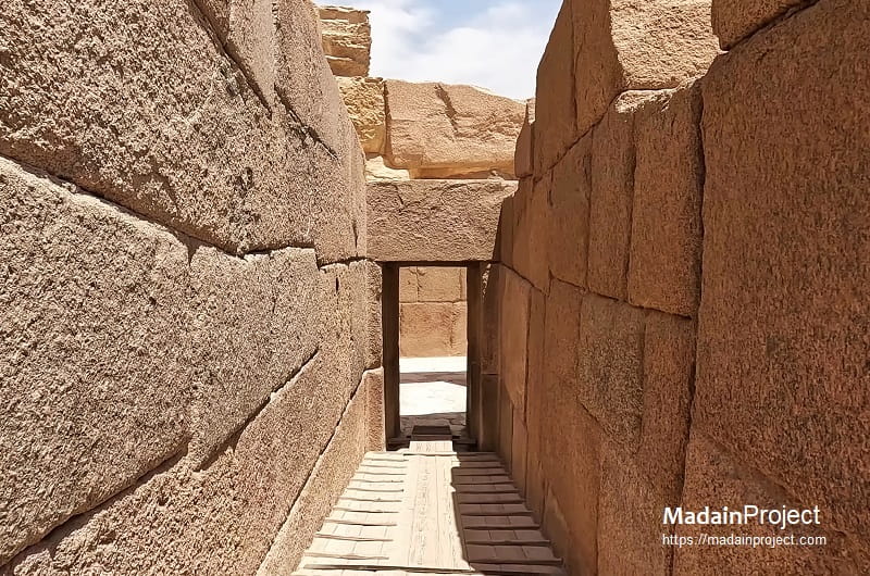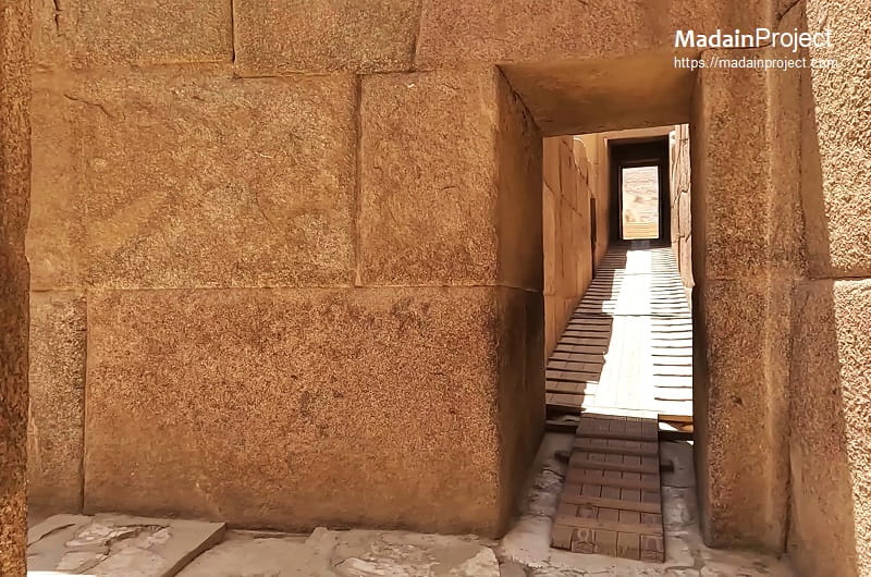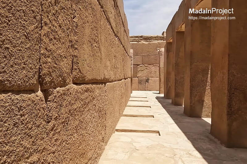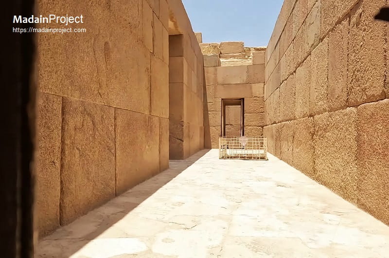 The inclined passage, or the northwest vestibule, situated at the north-western corner of the T-shaped pillared hall of the Valley Temple of Khafre functions as the principal architectural transition between the enclosed ceremonial interior of the temple and the ascending causeway leading toward the pyramid complex on the Giza Plateau. This corridor, which marks the beginning of the approximately 494-metre processional route to the mortuary temple, was carefully engineered to accommodate the gradual elevation change between the low-lying Nile floodplain and the higher desert plateau. Architecturally, the passage measures roughly 2.1 metres in width, creating a deliberately constricted processional space that contrasts with the expansive dimensions of the central hypostyle hall. The walls, constructed from finely fitted blocks of Aswan red granite rising to approximately three metres in height, originally supported a ceiling composed of large stone slabs, thereby producing an interior that was largely dark except for limited illumination provided by narrow light apertures. The floor pavement, executed in white alabaster, maintained the chromatic and material coherence characteristic of the temple’s interior spaces, while an alabaster threshold marked the formal boundary between the hall and the ascending corridor.