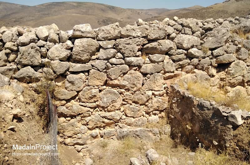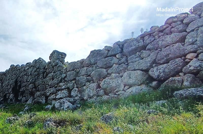 The wall is constructed in the polygonal-cyclopean order, like those of the citadels of Mycenae and Tiryns. Large boulders were used for the inner and outer facades, while the interior of the wall comprised a filling mainly of smaller stones. The fortification is preserved for its full length of approx. 450 meteers and encloses an area of some 2.4 hectares. The walls are approx. 5.5 to 7 meters wide and preserved to a height of some 7 meters. Three gates, one at the north and others at the east and west sides of the fortification provided access to the acropolis. A postern gate (syrinx) was also revealed in the western section of the wall.
