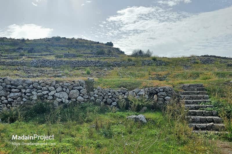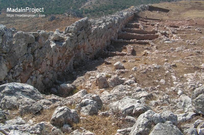 The cyclopean fortification wall of Midea acropolis surrounds the north-east and south-west upper slopes of the hill protecting the summit and a large sloping terraced area north of it, known as the Lower Terrace or the Lower Acropolis of Midea. The south-east side, wher the precipitous rock provided natural protection, remained unfortified.