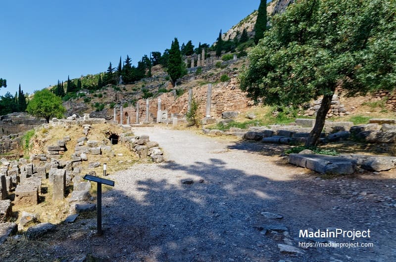 Directly adjacent to the Siphnian Treasury is an intersection on the so-called "Sacred Path", which is surrounded by the treasuries of many Greek cities. All of these, including the treasuries of the Boeotians, the Magarians and the Thebans, date to the late sixth and early fifth century BCE.