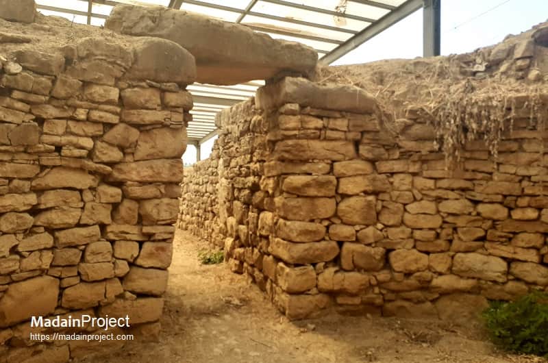 The tholos tomb, or the "royal tomb", at Dendra is located at the south-eastern edge of the cemetery and is dated to Late Helladic IIIA (circa 1450–1350 BCE). Its entrance dromos measures 17.90 meters in length and 2.20–2.50 meters in width, constructed of large rubble masonry two to three stones thick and rising to an original height of up to 5 meters; the stomion (doorway) between dromos and tholos was 3.50 meters tall when excavated and was found blocked by a rubble masonry wall. The vaulted chamber is 7.30 meters wide and its original height is calculated at circa 7 meters. Four unplundered burial pits were located beneath the chamber floor. The largest pit contained the interment of a man and a woman accompanied by rich grave-goods: bronze weapons, glass boar-tusk models, an ostrich-egg vessel, a stone lamp, gold, silver and bronze vessels, semi-precious seal-stones, and other valuable ornaments. A second pit contained a female burial with a necklace of gold rosettes, a gold ring and ornaments of faience, glass and ivory. Following the Late Bronze Age use, the tholos collapsed in the earlier part of the Geometric period (circa 1050–700 BCE); a later (Protogeometric / 9th-century BCE) secondary burial was placed in the blocking wall.