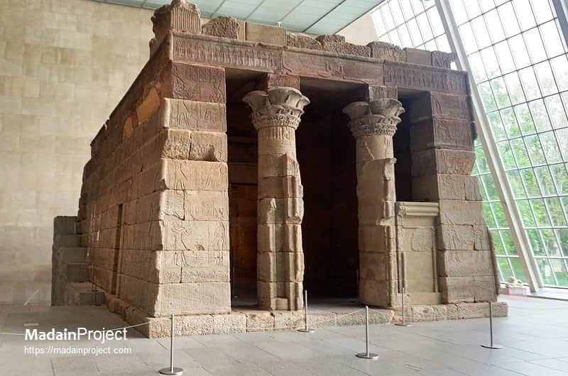 The Temple of Dendur is a Roman-period Egyptian temple originally located along the Nile River in the Nubian region of southern Egypt. Commission Constructed from Nubian sandstone around 15 BCE, during the reign of Emperor Augustus, it was dedicated to the goddess Isis and two deified Nubian brothers, Pedesi and Pihor. Its architecture, though modest in size, features traditional Egyptian design elements, including a pylon gate, lotus-and-papyrus columns, and extensive relief carvings that depict Augustus as a pharaoh making offerings to Egyptian gods. Read more