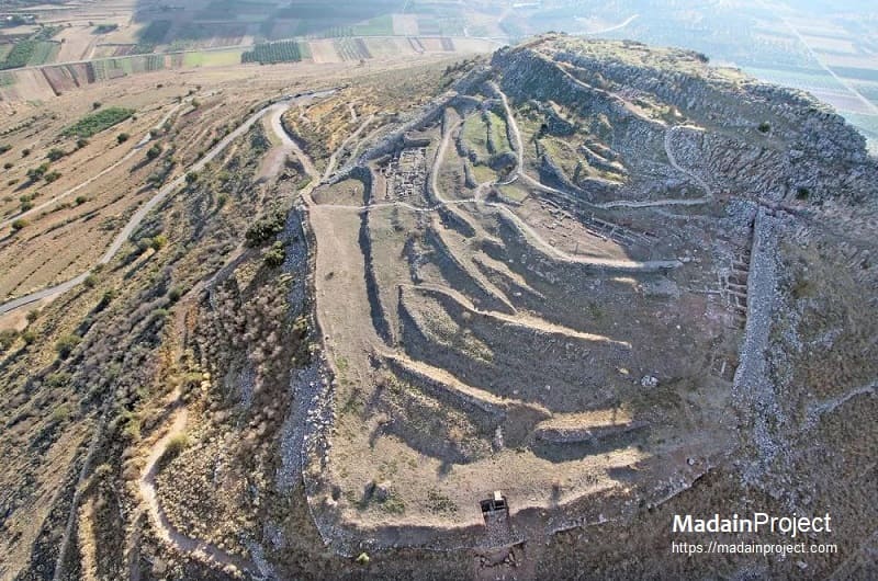 Ancient Midea (Μιδέα) was a major Mycenaean center in the Argolid, composed of a heavily fortified acropolis and a surrounding, as yet incompletely defined, lower town. Strategically positioned on a conical hill dominating the eastern plain between Mycenae and Tiryns, its impressive Cyclopean fortification walls enclosed a palatial complex that flourished particularly during the Late Helladic period (circa 13th century BCE). Archaeological investigations have revealed Midea's function as a prominent administrative, economic, and ceremonial hub, with workshops and storage facilities containing Linear B inscribed jars and other valuable artifacts located both within the citadel walls and on the terraced slopes below.