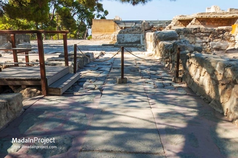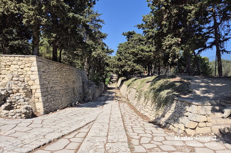 The so called "royal road" started in the so-called "theater area" and runs westward. The raised paved road continues in the western direction for a length of approx. 150 meters. It passes underneath the modern road to Herakleion connecting the palace with the Minoan town, which extended to the west and north. Evans named the rod the "royal road". Along the length of the road are town houses with workshops on the ground floor and residential areas on the upper floor.