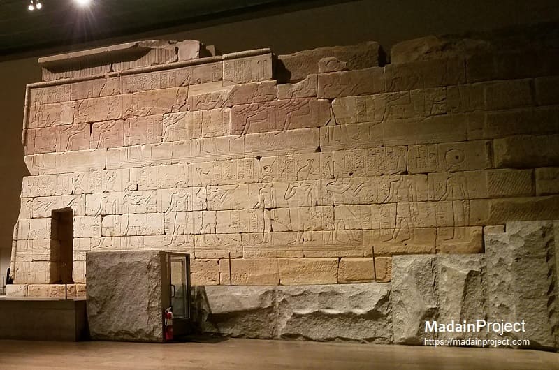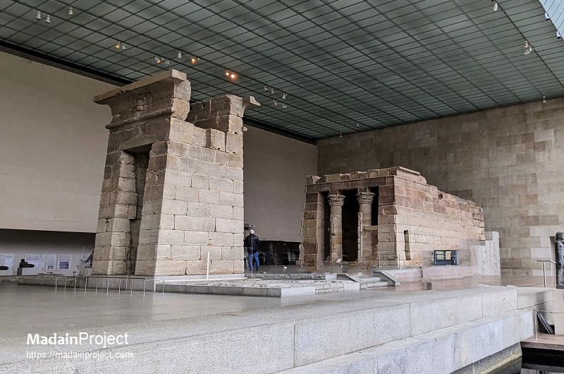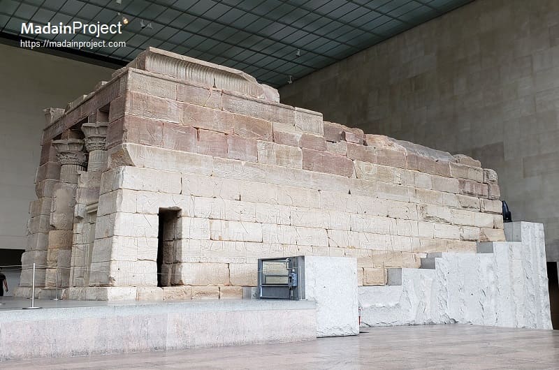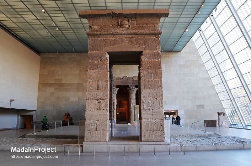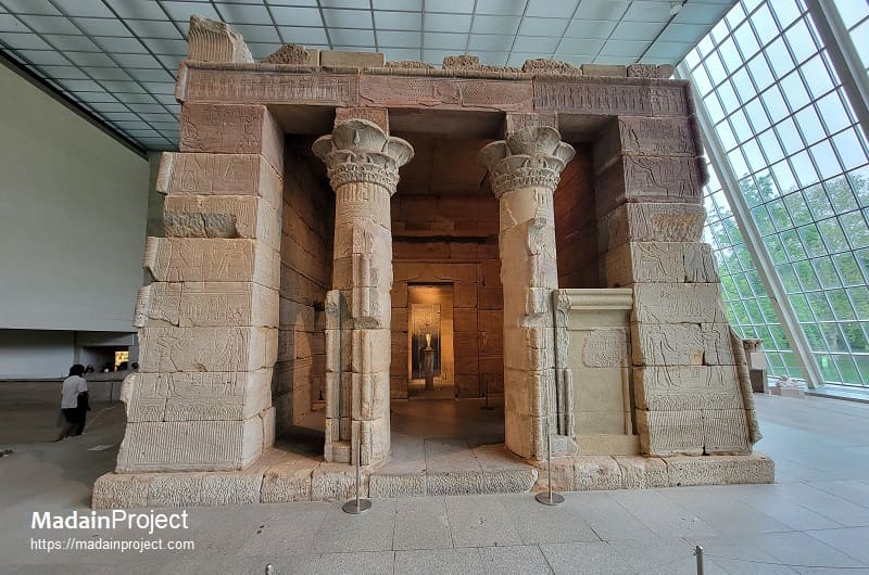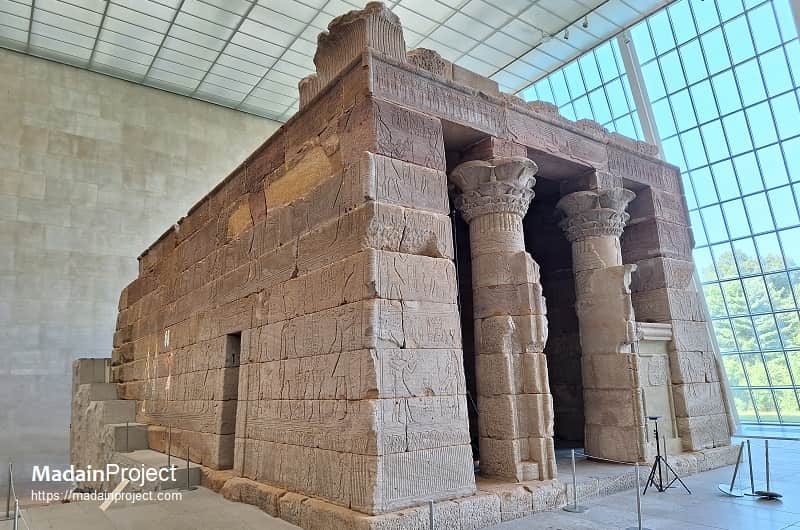 The Temple of Dendur is an ancient Egyptian sandstone temple originally constructed during the early Roman period under the reign of emperor Augustus (27 BCE–14 CE). Dedicated to the goddess Isis, as well as to the deified local Nubian brothers Pedesi and Pihor, the temple exemplifies the synthesis of Egyptian religious tradition and Roman imperial authority. It was built in the region of Nubia, near the west bank of the Nile, approximately 80 kilometers south of modern Aswan. Today, it resides in the Metropolitan Museum of Art in New York City, having been relocated there in the 1960s CE after the construction of the Aswan Dam threatened to submerge it beneath the waters of Lake Nasser.