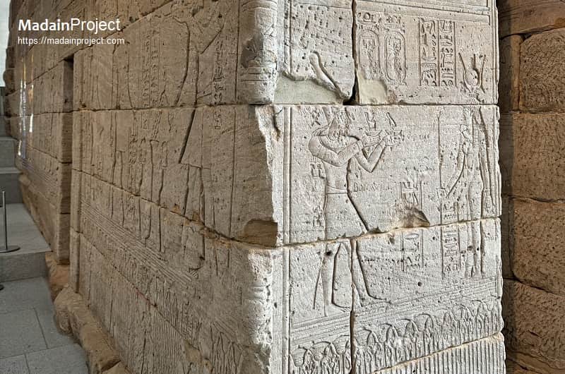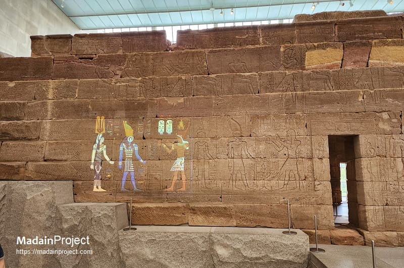 The decorative scheme of the Dendur Temple illustrates both continuity and adaptation in late Egyptian religious art. The exterior reliefs depict Emperor Augustus in the guise of a pharaoh, performing ritual offerings before the deities Isis, Osiris, and their son Horus, alongside the local gods Pedesi and Pihor. The inscriptions are rendered in hieroglyphs but name Augustus as “Caesar, Son of a God”, a formula that bridges Roman imperial ideology and Egyptian divine kingship. The interior walls continue these themes, portraying the emperor as the provider of offerings and sustainer of cosmic order.