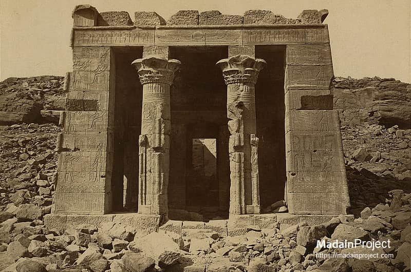 The temple was built from fine-grained sandstone quarried locally in the region of Nubia. Its masonry is precisely dressed and laid in regular courses, demonstrating the continuity of Egyptian stoneworking techniques during the Roman period. The orientation, roughly east–west, aligns with the rising sun, a symbolic gesture toward rebirth and the solar aspects of Isis. The walls, over one meter thick, were designed to endure the seasonal Nile floods that once reached the temple’s base. The roof is composed of massive stone slabs, slightly pitched to allow drainage, and was originally accessible via an external stairway (now lost). Despite its small dimensions, the structure’s proportions are harmonious and balanced, testifying to the skill of Egyptian builders who had adapted traditional methods to imperial commissions.